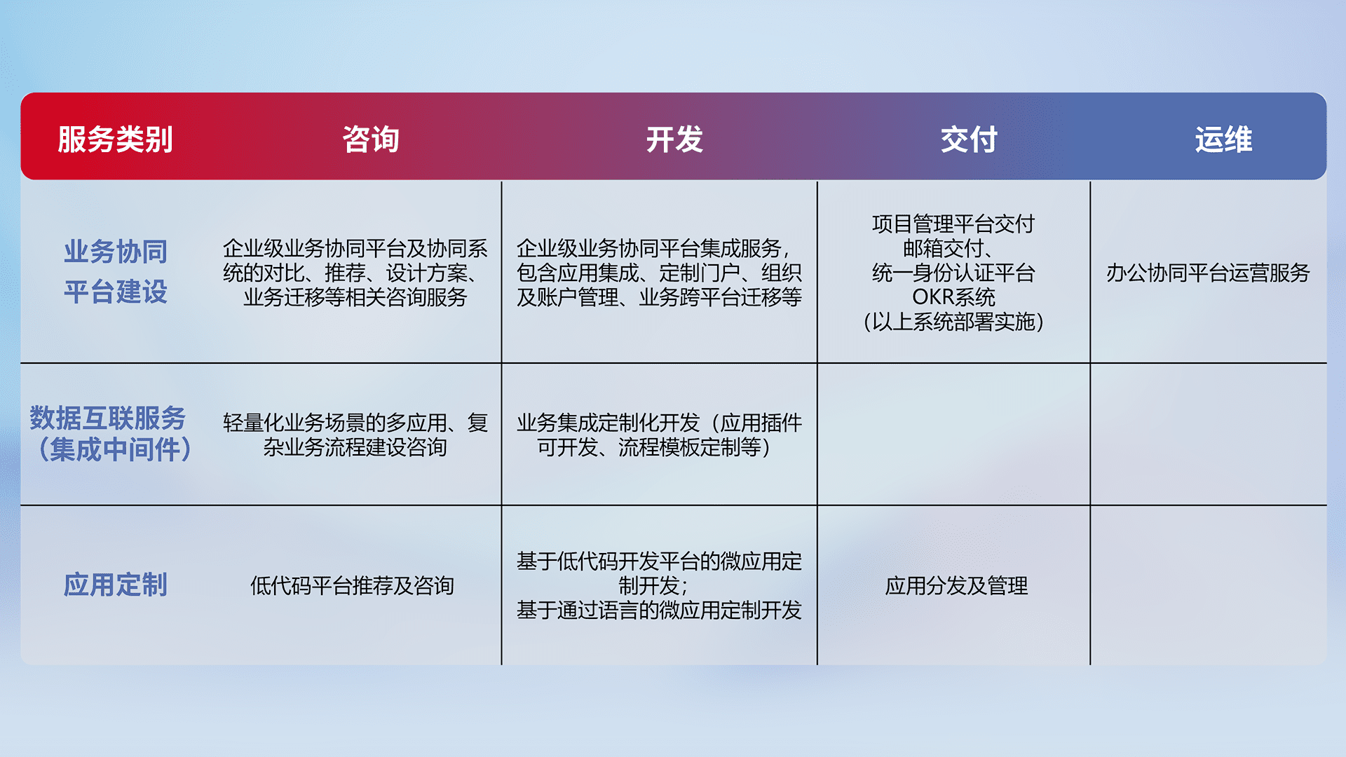 针对钉钉、、、企微、、、IDaas等平台级产品提供产品的规划、、、、方案、、、、交付、、定制化开发等服务,,,实现如统一协同办公、、智能客户服务、、、、混合会议管理、、、智能数据查询、、、、等业务场景,,,,实现数字化转型。。。