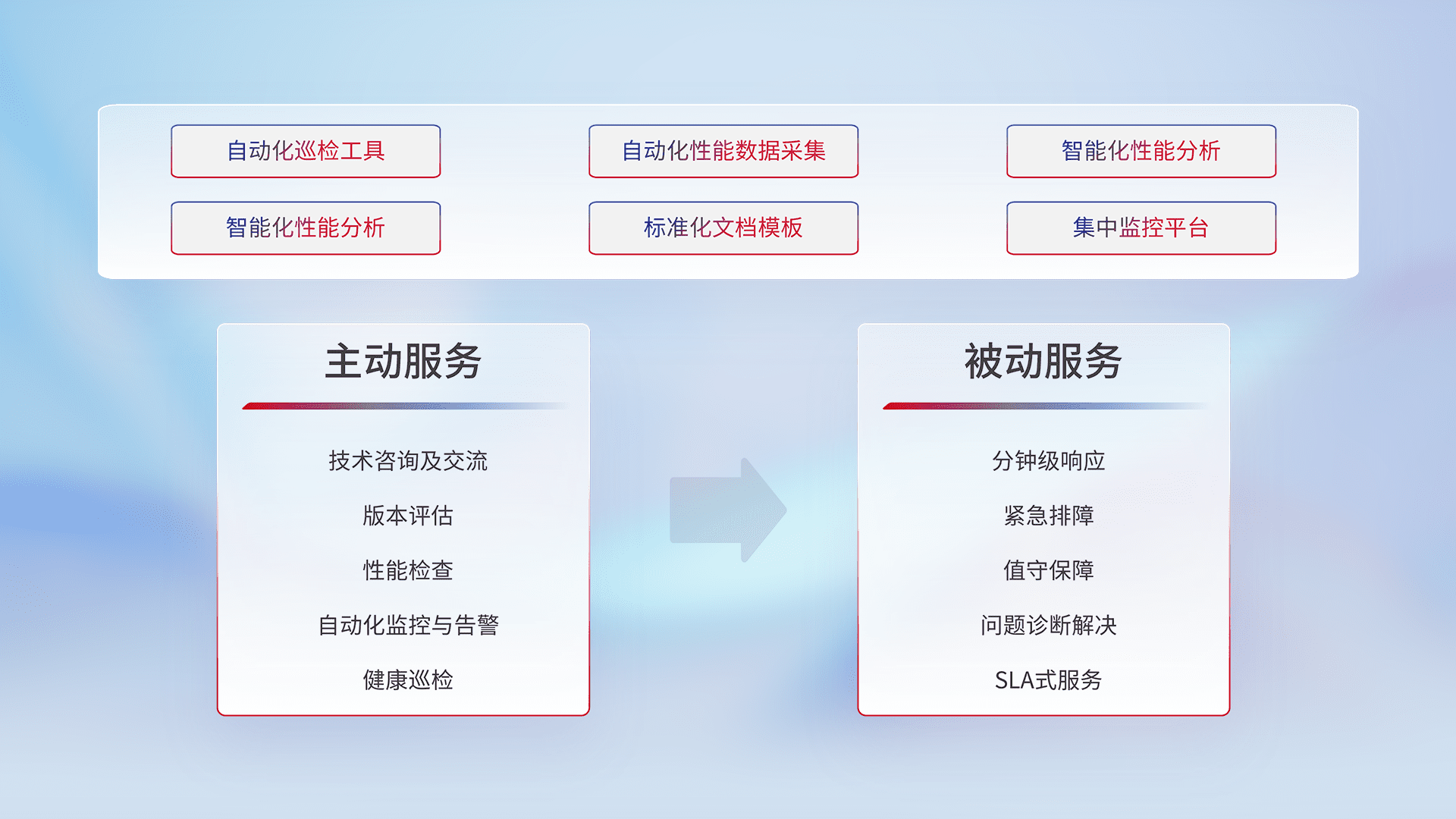 智能化工具和标准化文档,,,,保障服务质量,,,提供主动服务(包含技术咨询、、、、版本评估、、性能检查、、、、自动化监控与告警、、、、健康巡检)和被动服务包含(分钟级响应、、紧急排障、、、值守保障、、、问题诊断解决、、、SLA服务)。。。